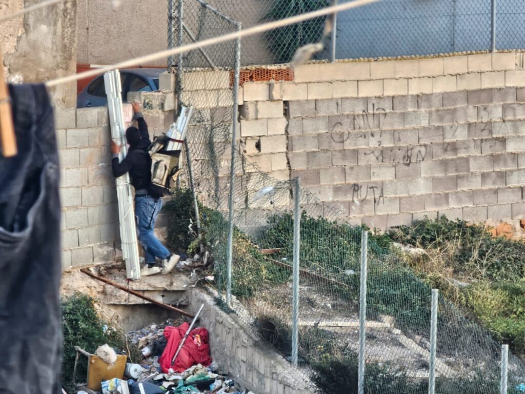 Ladrón, en la tapia trasera de la parcela del antiguo centro de salud de San Antón, durante un momento del robo del aluminio.